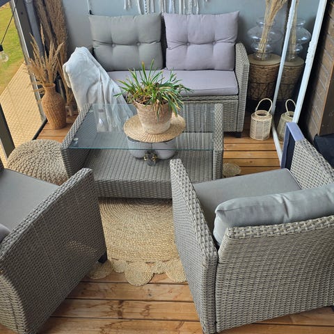 Siistissä kunnossa oleva polyrottinkinen parvekekalustesetti.
