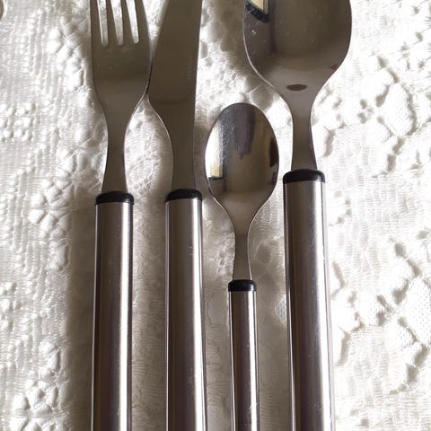 Hackmanin haarukoita ja lusikoita myyntiin samassa setissä. Suorat metallivarret tummalla renkaalla varressa, määrä näkyy kuvissa.