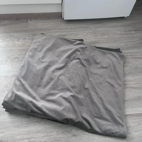 IKEA:n verhot, harmaat ja mustat, kevyttä kangasta. Yläreunassa nauha ripustusta ja rypytystä varten. Lähtee myös vaikka kahvipakettia vastaan.