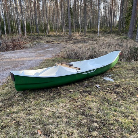 Valkoinen lasikuituvene myynnissä, sopii soutu- tai perämoottorikäyttöön. Pohjassa köli ja perässä tasainen laita moottorille, kyljissä koristekuviot.