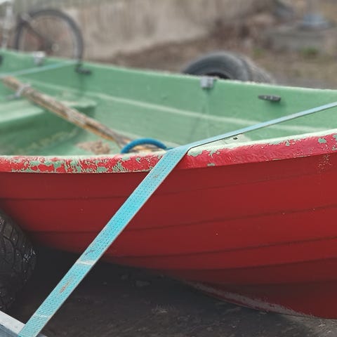 Valkoinen lasikuituvene soutu-/perämoottorivene