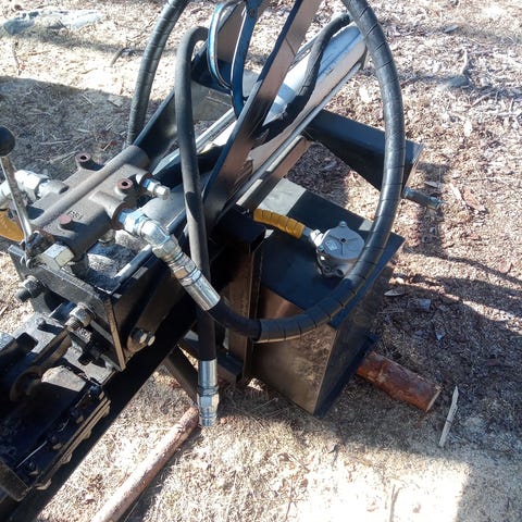 Itse tehty, traktorin hydraulikalla toimiva halkoja. Iskun maks. pituus 1100, isku säädettävissä eri pituuksille. Yhdellä vivulla toiminto ja automaattinen palautus. Mukana 2/4 ja 2/6 terät.