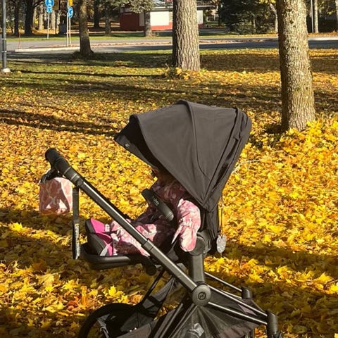 Istuin on helposti käännettävissä, viisipistevaljaat, iso kuomu ja tilava tavarakori. Kasattuna menee pieneen tilaan. Tuoksuton, eläimetön koti.