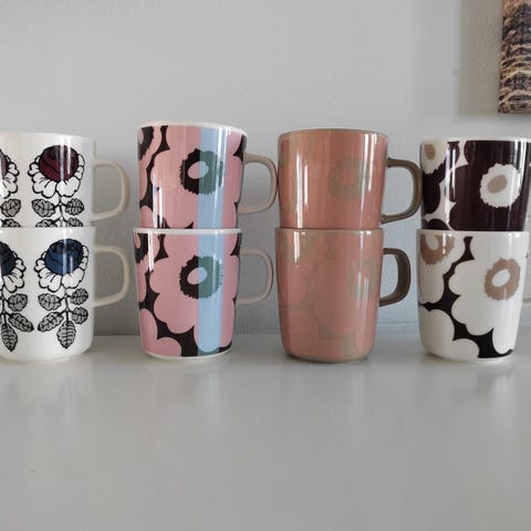 1980-luvun lopulta olevat marimekko-mukit. Mukin tilavuus 2,5 dl.