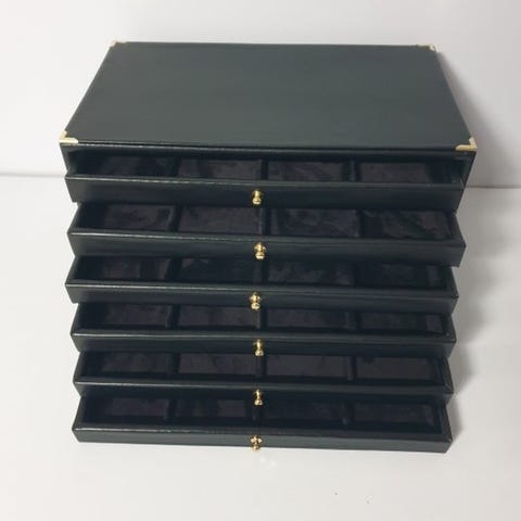 Kolikkoteline mustasta keinonahasta, 72 paikkaa4 ulosvetotikkaaSisäpuoli mustaKullanväriset metalliosatMitta 34 x 19 x 19 cmSisäisten jakajien mitat noin 5 x 4,5 cmKolikkoteline on täysin käsin valmistettu korkealaatuisista materiaaleista.Valmistettu puusta ja keinonahasta.Erinomainen kunto, uudenveroinen.Huolellinen toimitus