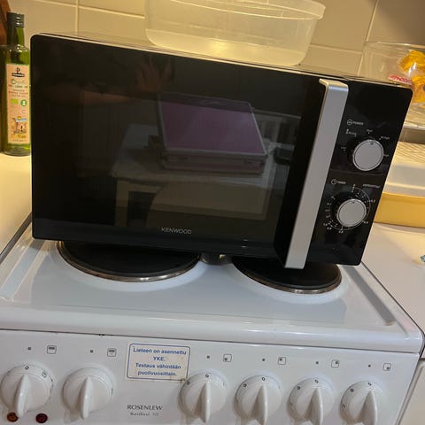 Whirlpoolin musta mikroaaltouuni, jossa peililasiovi ja kosketuspaneeli sivussa. Sisällä lasinen pyörivä lautanen ja selkeät pikavalinnat ylhäällä.
