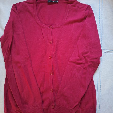 Punainen viskoosinen neuletakki kokoa XL. Edessä nappikiinnitys koko matkalta alas. kai mitta 53ja pituus 64cm.