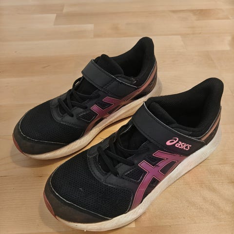 Asicsin mustat ja liila logo tytön lenkkarit, koko 30. Tarrakiinnitys, kevyt pohja ja kuvioitu ulkopohja. Tosi kevyet ja hyvät kengät lapselle. Hieman nafti koko.