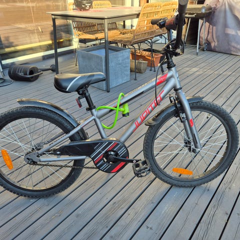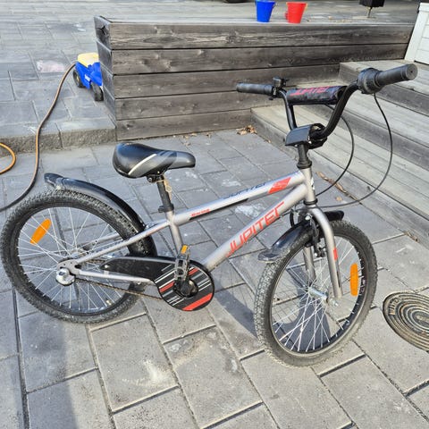 Jupiter Typhoon 20" lasten maastopyörä, valkoinen runko punaisilla ja harmailla teipeillä. Pyörässä on lokasuojat, juomapulloteline ja 3-vaihteinen Shimano Nexus. Jalkajarrut. Sopii 105-130 cm pituiselle lapselle.