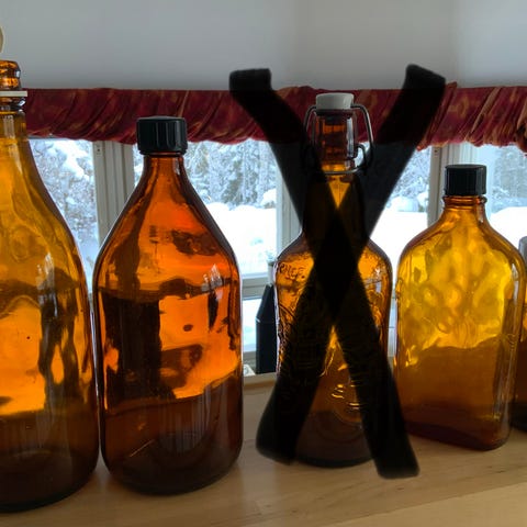Vanha iso ruskea lasipullo, joka on ehkä ollut apteekkikäytössä. Ehjä ei jälkiä. Korkeus noin 40cm