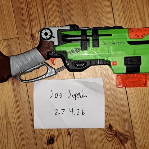 Nerf Slingfire -sarjan leikkipyssy, vihreä-oranssi runko ja ruskea perä. Toimiva vipulukko ja irrotettava lipas tekevät ampumisesta hauskaa.