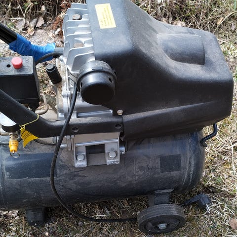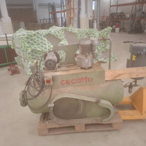 Omavalmiste, toimiva vanhempi sähkökäyttöinen kompressori, jossa kaksi pumppua ja suuri paineastia pyörillä. Varustettu painemittarilla, säätimellä ja useilla letkuilla sekä pistokkeella.