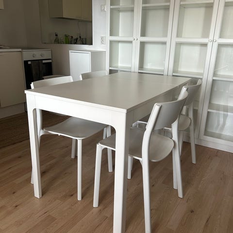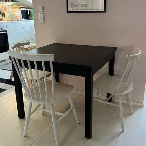 Myydään IKEAN valkoinen Melltorp ruokapöytä ja kaksi valkoista Ekedalen tuolia vaalenharmaalla istuimella. Istuinkangas on irroitettavissa. Pöydän mitat: L 160 x S 75 x K 75 cm. Tuolin mitat: L 43 x S 43 K 95 cm. Pöydässä ja tuoleissa käytön jälkiä mutta muutoin siistissä kunnossa. Nouto Espoosta, Tillinmäestä.
