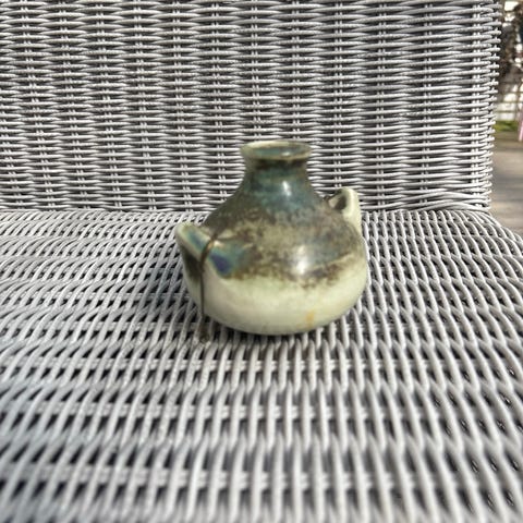 Myydään oliivinvihreä ja soma öljylamppu, korkeus 11 cm. Lasitettua keramiikkaa.