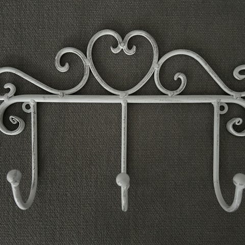 Myydään siisti ja kaunis, valkoiseksi maalattu metallinen seinähylly, jossa on naulakko. Hyllyssä on hienoja koristeellisia koukeroita sivuilla ja takaseinässä, mikä antaa sille kivan romanttisen tai maalaisromanttisen ilmeen.