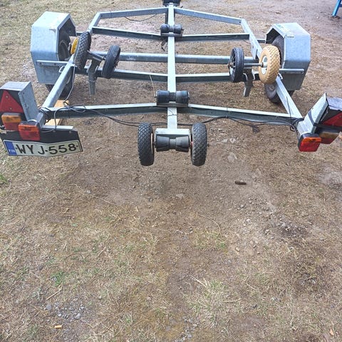 Hyvä traileri, kaikki rullat muovia ja keulan lepuutinkumi vaihdettu kunnolliseen. Kitkavinssi - ei lyö sormille.