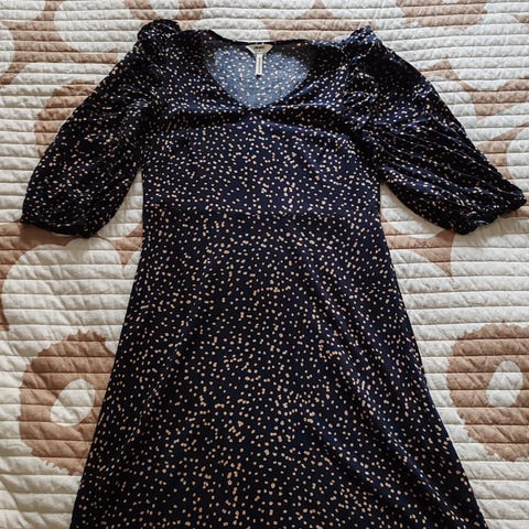 OBJECTin viskoosinen kesämekko koko 34, musta pohja ja vaalea pilkullinen kuosi. Lyhythihainen malli, napitus edessä ja vyötäröllä kiristysnauha.
