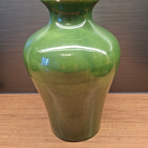 Punainen keramiikkamaljakko, jossa leveä kaula ja lasitettu pinta. Tämä esine on Italica Arsin Italiassa 1960-luvulla valmistama vintage-keramiikkamaljakko, joka tunnetaan "atomic red" -lasitteestaan.