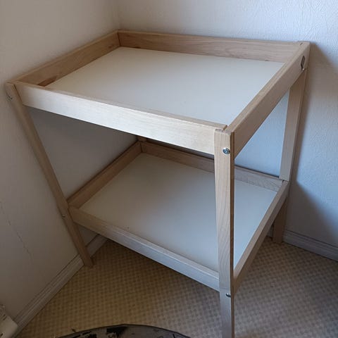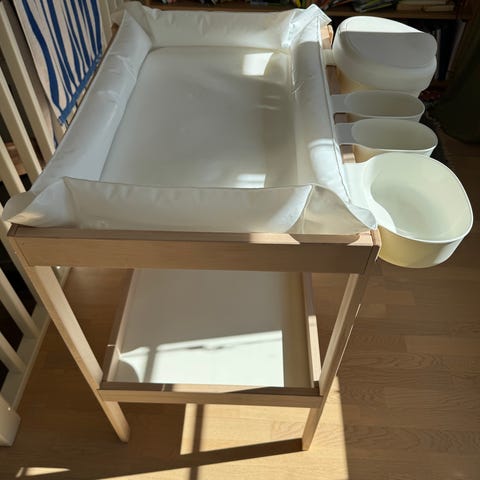 Myydään hyvässä kunnossa oleva hoitopöytä. Mukaan saa SKÖTSAM hoitoalustan ja siihen kuuluvan päällisen. Jotain pieniä käytönjälkiä, mutta yleisilmeeltään siisti. Esim. Alatasolla jotain säilytyskoreista tulleita jälkiä.