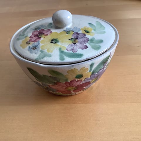 Arabian kulho, savea, käsin maalatulla kukkakuviolla. Halkaisija 13 cm, korkeus 6 cm.