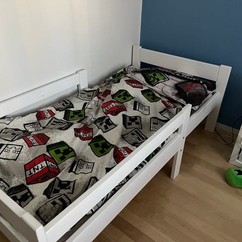 Muuramen valkoinen jatkettava Jolla lastensänky, jossa päädyissä suojalaidat. Puinen runko ja alle jää hyvin tilaa säilytyskoreille tms.