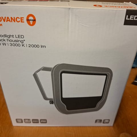 Musta neliönmuotoinen LED-ulkovalaisin, jossa iso valopinta ja runsaasti ledejä. Säädettävä kiinnike takana helpottaa asennusta seinään tai kattoon.