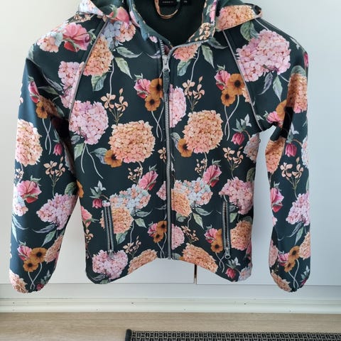 Siisti ja pehmeä hupparitakki harmaa mustalla kukkakuosilla. Edessä vetoketju, huppu, taskut ja lämmin pehmeä sisäpinta. Hyvä ulkoiluun, vapaa aikaan ja välikerrokseksi.