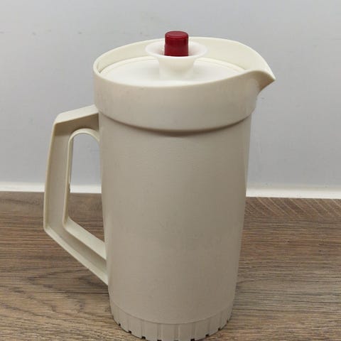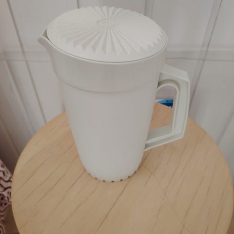 Tupperware vaalea muovikannu tiiviillä kannella ja kaatonokalla. Kannussa on tukeva kahva ja kansi painonapilla. Korkeus noin 20cm, halkaisija noin 11cm.