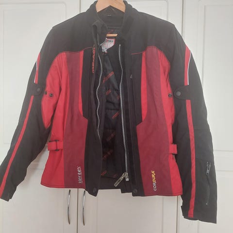 Speederin musta-punainen ajotakki ja mustat ajohousut, koko paketti 50€, kaupan päälle pitkät nahkaiset ajohanskat. Takissa vyötärökiristys ja useita säätöremmejä, housuissa vetoketjut lahkeissa ja hanskoissa vahvistetut rystyssuojat.