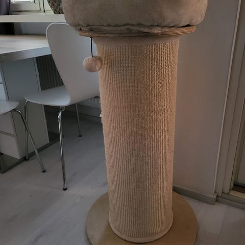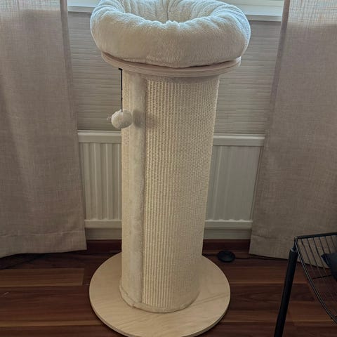 Valkoinen kissatorni, jossa useampi piilopaikka ja pehmeä peti päällä. Ulkopinta sopii hyvin raapimiseen ja sisällä on mukavat kolot lepäilyyn. Kunto erinomainen, jäänyt lähes käyttämättä. Ovh 89 euroa.
