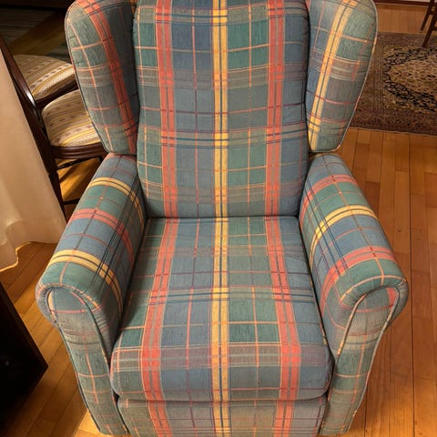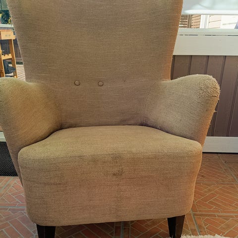 Vielä hyvä nojatuoli mekanismilla. Hieman likaa / kulumaa pinnassa jota ei ole yritetty puhdistaa. Muuten pitäisi olla hyvä nojatuoli jonka saa myös lepoasentoon.