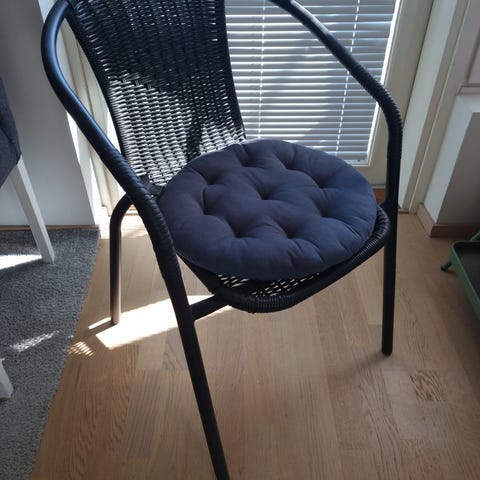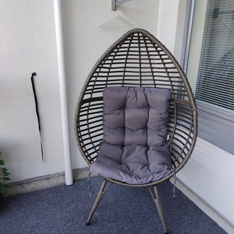 Harmaa rottinkinen nojatuoli, jossa tummanharmaa istuinpehmuste. Metallijalat ja kaareva runko, sopii hyvin löhöilyyn. Ollut ainoastaan sisäkäytössä, vaikka onkin ulkokäyttöön.