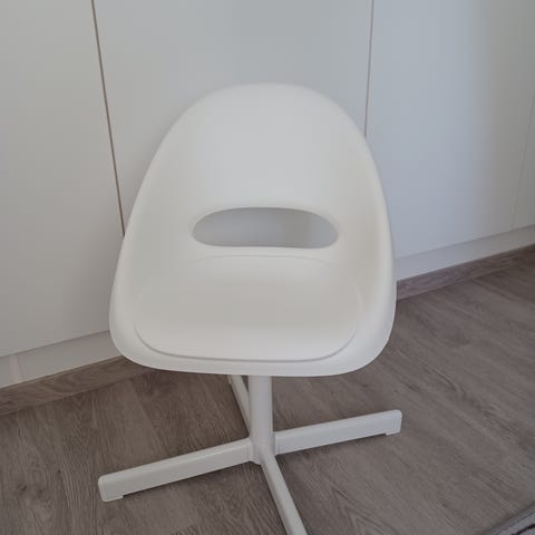 IKEA:n valkoinen lasten tuoli pyörivällä jalustalla. Kevyt siirrellä ja helppo pyyhkiä puhtaaksi.