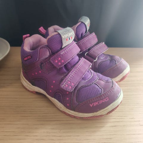 Viking välikausikengät koko 26, punavioletti väri ja kaksinkertaiset tarranauhat.