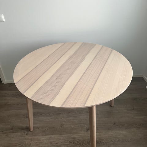 Myydään pyöreä ruokapöytä. Leveys 120cm. Tarkoitettu neljälle henkilölle, mahtuu jopa 6 henkilöä ruokailemaan. Tasossa läheltä katsottuna muutamia kevyitä käytönjälkiä.