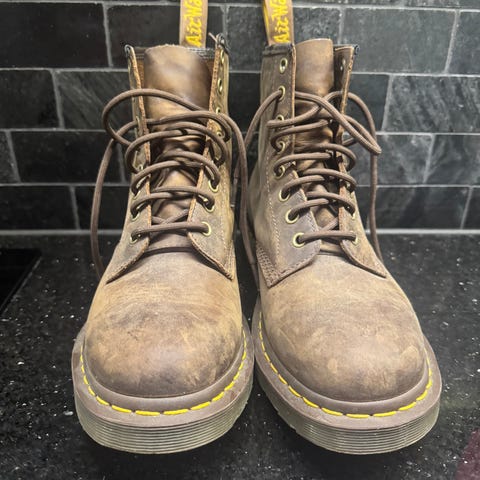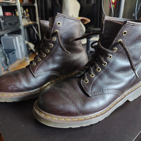 Mainiokuntoiset pehmeämpinahkaiset Martensit. Näyttäisi olevan tämä malli: https://www.drmartens.com/fi/fi/460-pascal-ambassador-lace-up--maiharit-cashew/p/31976253. Säännöllisesti huollettu.