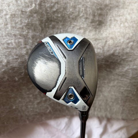 Väyläpuu 3 on 15,5 asteinen Cobran säädöillä. Regularin Helium 5F3 varrella ja Lamkin 360 Crossline standard gripillä. Nupissa vähäistä käytönjälkeä, mutta kokonaisuus todella siisti. Hp 130€. https://pluggedingolf.com/cobra-aerojet-max-fairway-wood-review/
