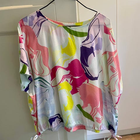 Makia lyocell-pusero koko L, valkoinen mustalla kukkakuosilla. Takana pieni vetoketju pääntiellä ja lyhyet raglanhihat. Kainalo-kainalo 65 cm, olka-helma 63 cm, takaa 66cm.