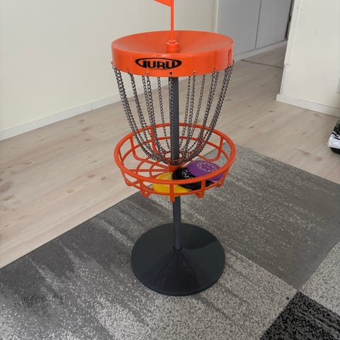 Metallinen frisbeegolfkori ketjuilla ja pyöreällä koriosalla. Seisoo jalustalla, helppo laittaa pihaan tai mökille.