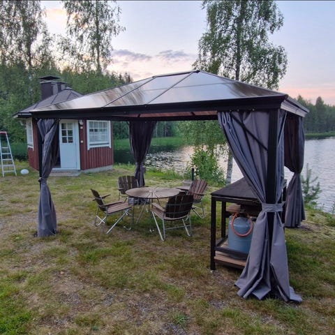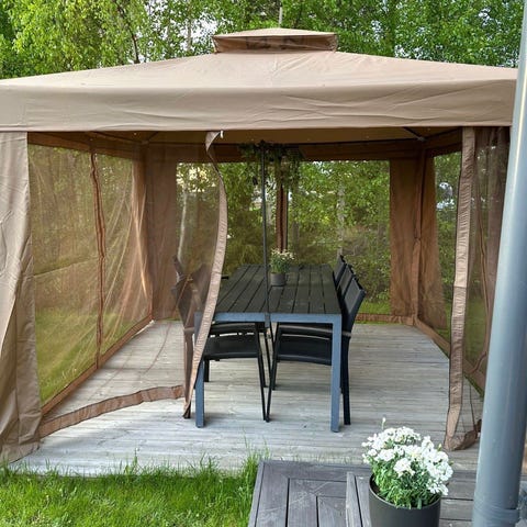 Paviljonki, sis sivuverhot ja hyttysverhot.