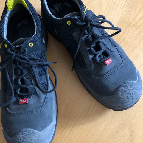 Jalaksen mustat nauhalliset työkengät koko 45, vahvistetulla kärjellä ja pitävällä pohjalla. Sisällä hengittävä verkkovuori ja kantapäässä lenkit helpottamassa jalkaan laittoa.