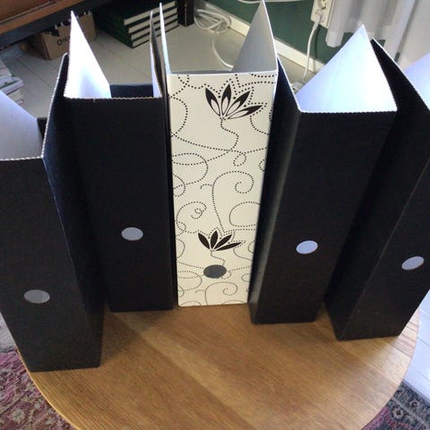 4 kappaletta mustia, pahvisia lehtikoteloita. Näissä voi säilyttää lehtiä, piirrustuksia ym. Ihan siistissä kunnossa, yksi etuosasta hieman taittunut ja kulmissa taittumaa. Puran auki lähetettäessä. Aikoinaan ostettu Prismasta.