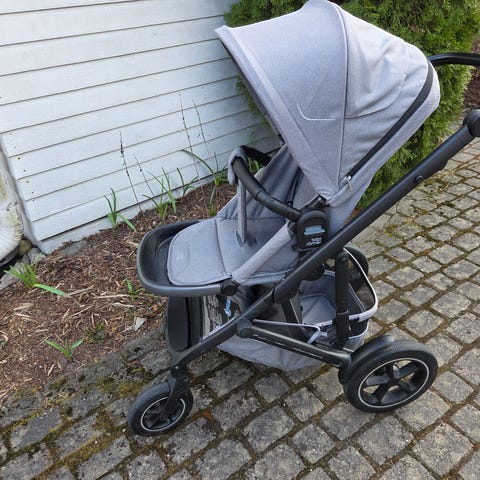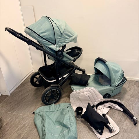 Britax Smile 4 -yhdistelmävaunut vaunukopalla & ratasosalla. Beigen sävyinen kangas ja musta runko. Ihanan kevyet!