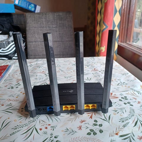 Täysin toimiva ja muuton jälkeen turhaksi jäänyt reititin. Mukaan latausjohto ja haluamasi määrä ethernet-kaapeleita.