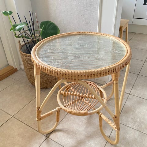 Lilaksi kalustemaalilla maalattu rottinkipöytä lasikannella.