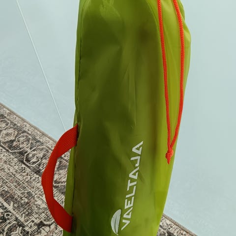 Kuru-merkkinen vihreä kupoliteltta, mukana alumiiniset kaaret ja narut. Sisäteltassa vetoketjullinen verkko-ovi ja teltta pakkautuu omaan vihreään pussiin.