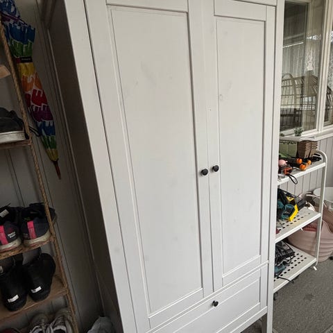 Valkoinen vaatekaappi, jossa kahdet peiliovet ja vaatetanko sisällä. Alhaalla on leveä laatikko metallivetimillä säilytystä varten. Hieman kulumaa maalipinnassa vetolaatikossa. Siitä kuva.