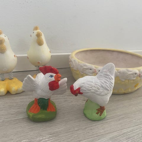 Pääsiäiskoristeet: kukkaruukku, ruukku / maljakko, muki, kynttilä ja servetit.