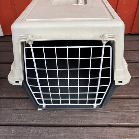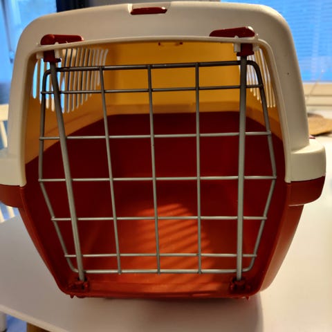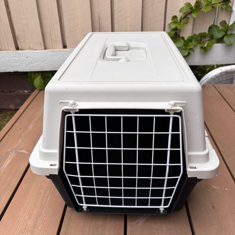 Tukeva muovinen kuljetusboxi koiralle. Metallinen etuovi lukituksella ja ritiläikkunat. Metalli osat ovat ruostuneet muuten boxi on hyvässä kunnossa. Koko pituus 60cm korkeus 50cm leveys 40cm