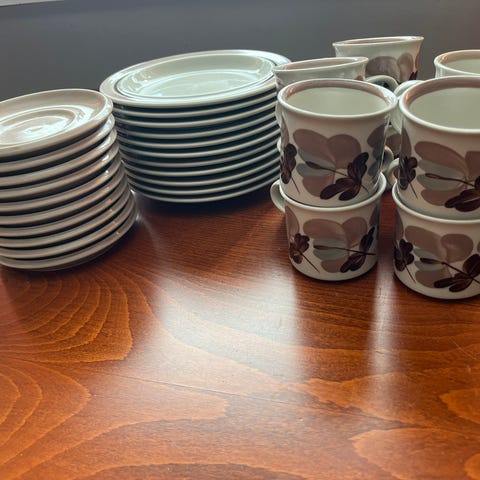 Koko astiasto mitä edellä lueteltu tai erikseen 6 kpl kuppeja+kupin aluslautasia. Jos ostat 6kpl kuppeja ja aluslautasia hinta sovitaan ja lähetys onnistuu pakettina.